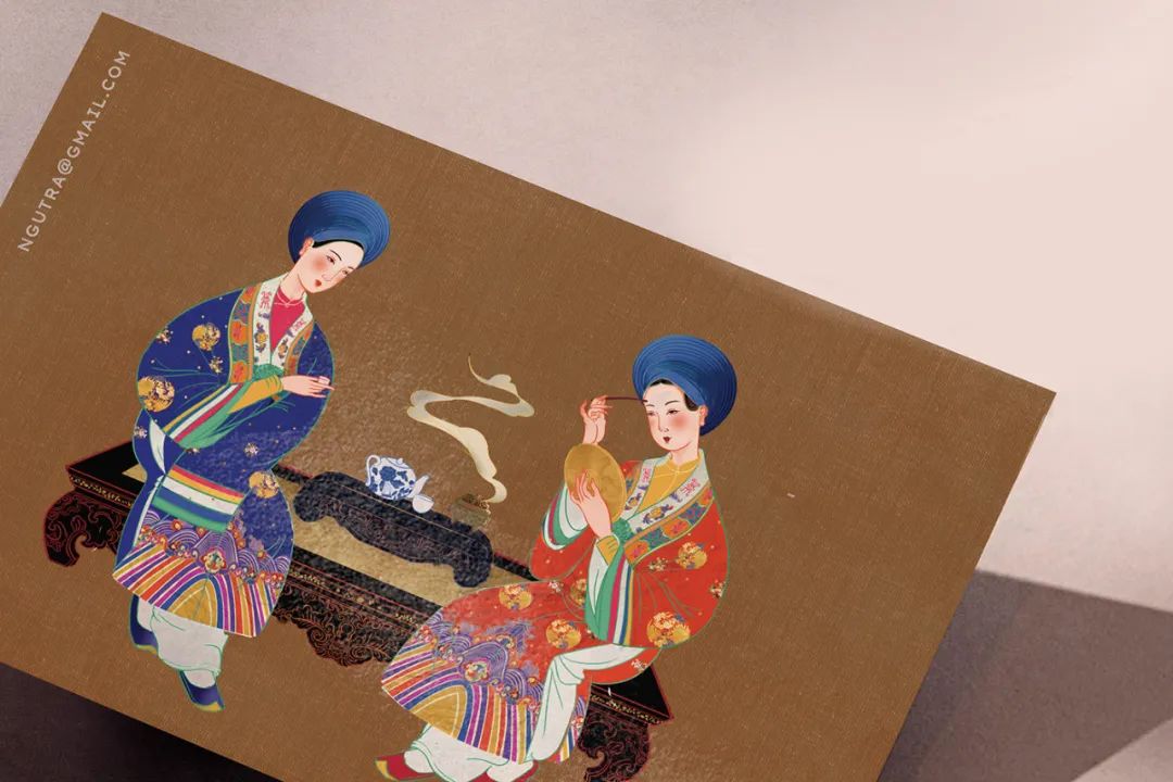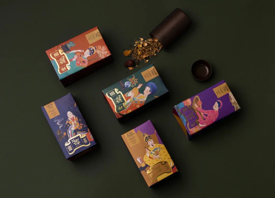 包装的设计灵感来自王妃居住的清明宫,以及太后的住所。对于茶的其他口味则取自越南著名的地方景象。这些插图的设计都取自皇宫文化。其不同的口味均采用皇家文化中的人物作为包装的主形象。加上印刷工艺整个包装看上去皇室文化非常浓厚。