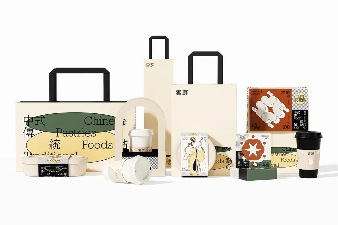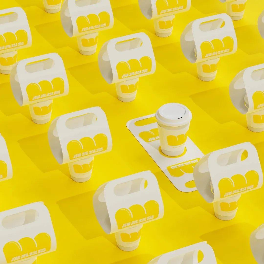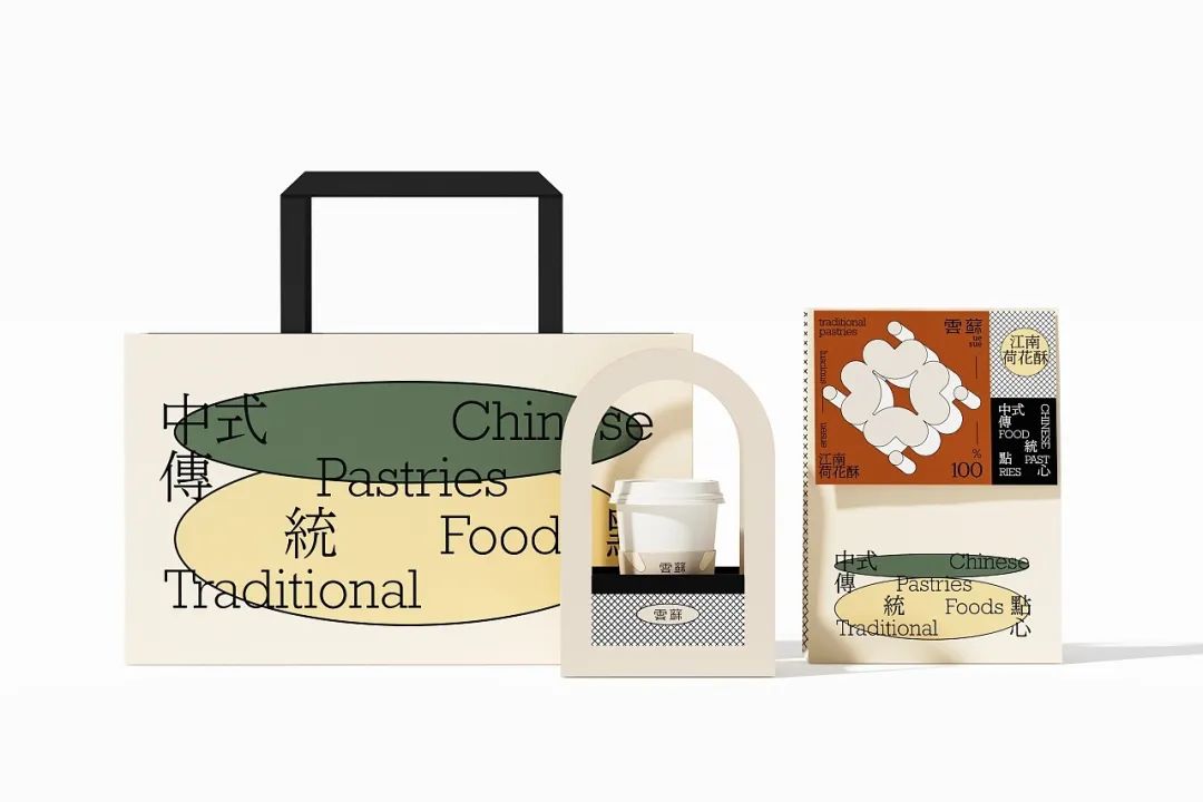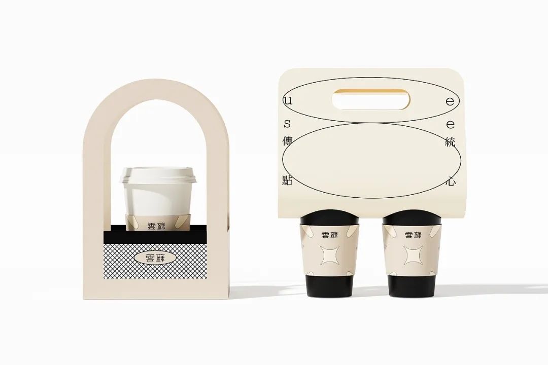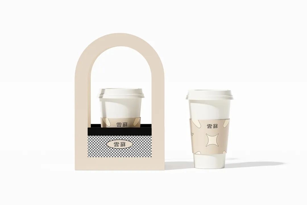 有糕点,也别忘了来一杯饮品,给这份中式下午茶别样的仪式感。杯套设计延续一致的莫兰迪色系风格,标贴上的极简几何图形抽象表现出双手呈上饮品的动作含义,表达了品牌的真挚心意。