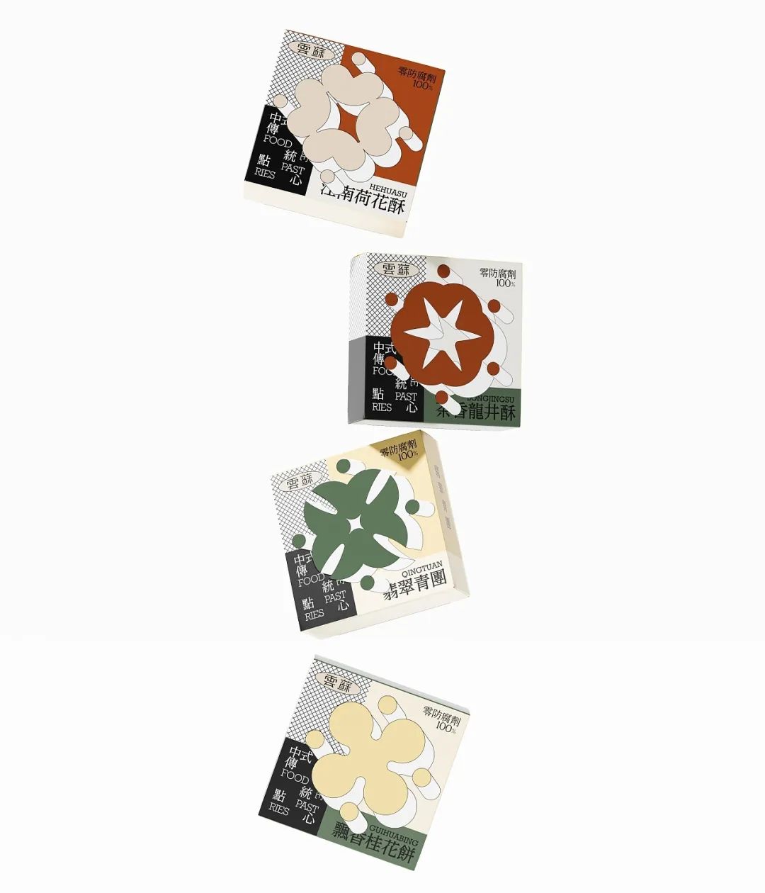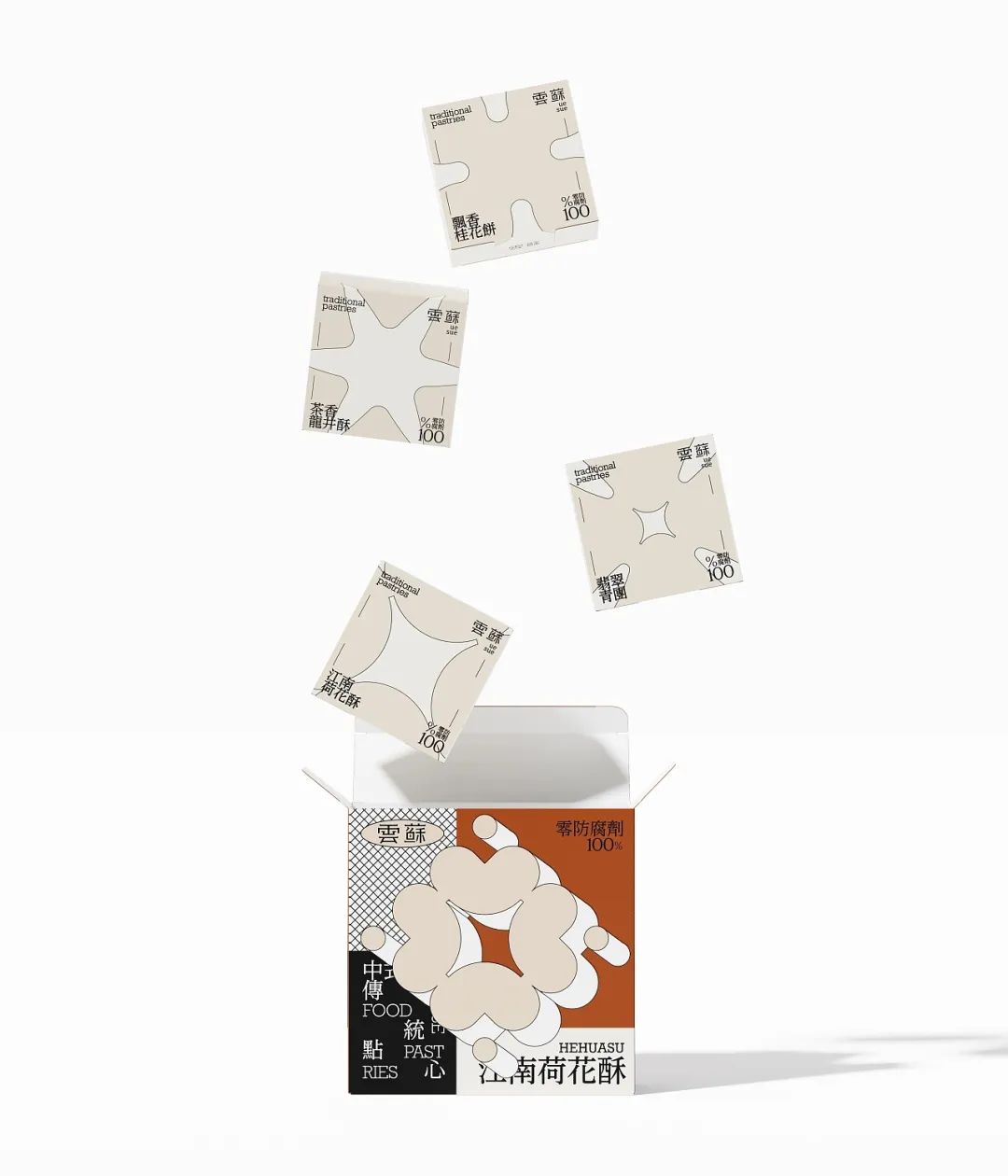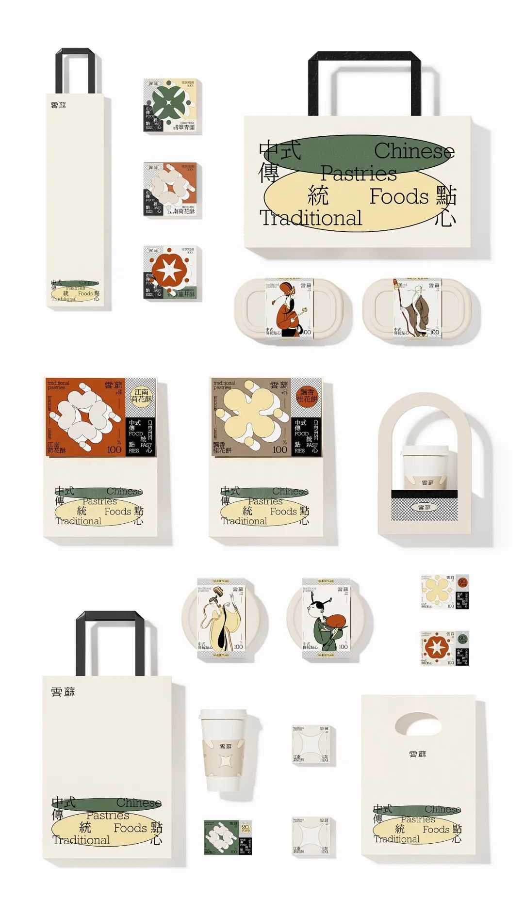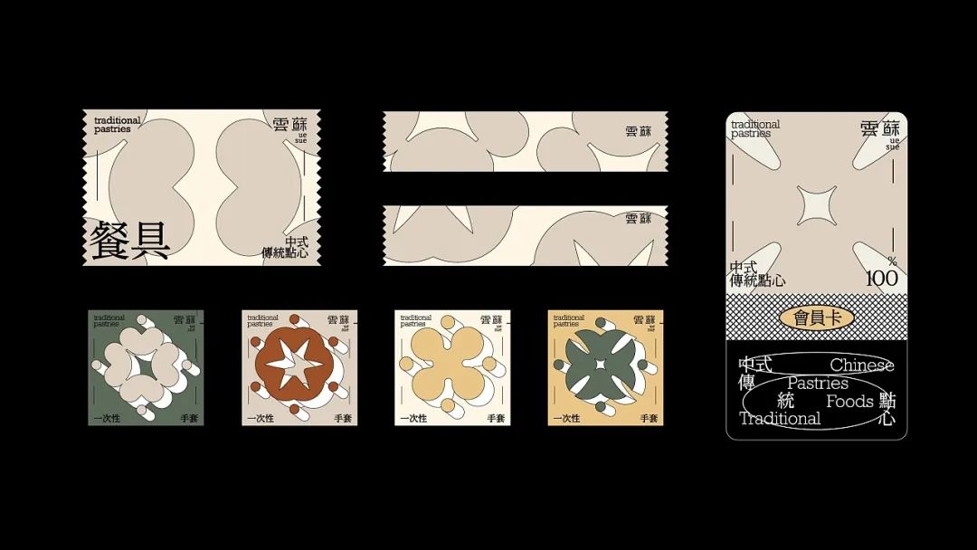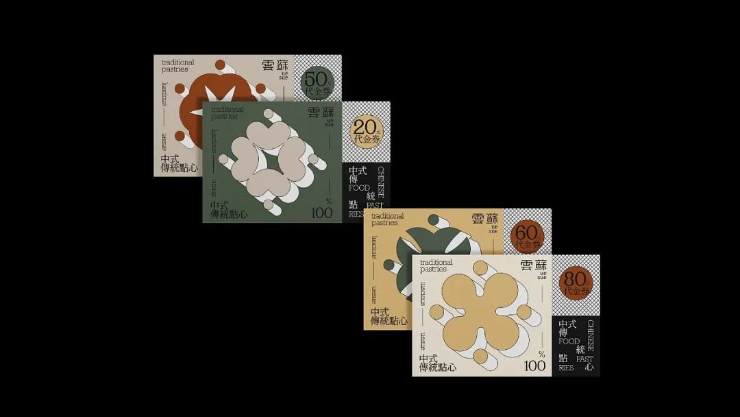 有糕点,也别忘了来一杯饮品,给这份中式下午茶别样的仪式感。杯套设计延续一致的莫兰迪色系风格,标贴上的极简几何图形抽象表现出双手呈上饮品的动作含义,表达了品牌的真挚心意。