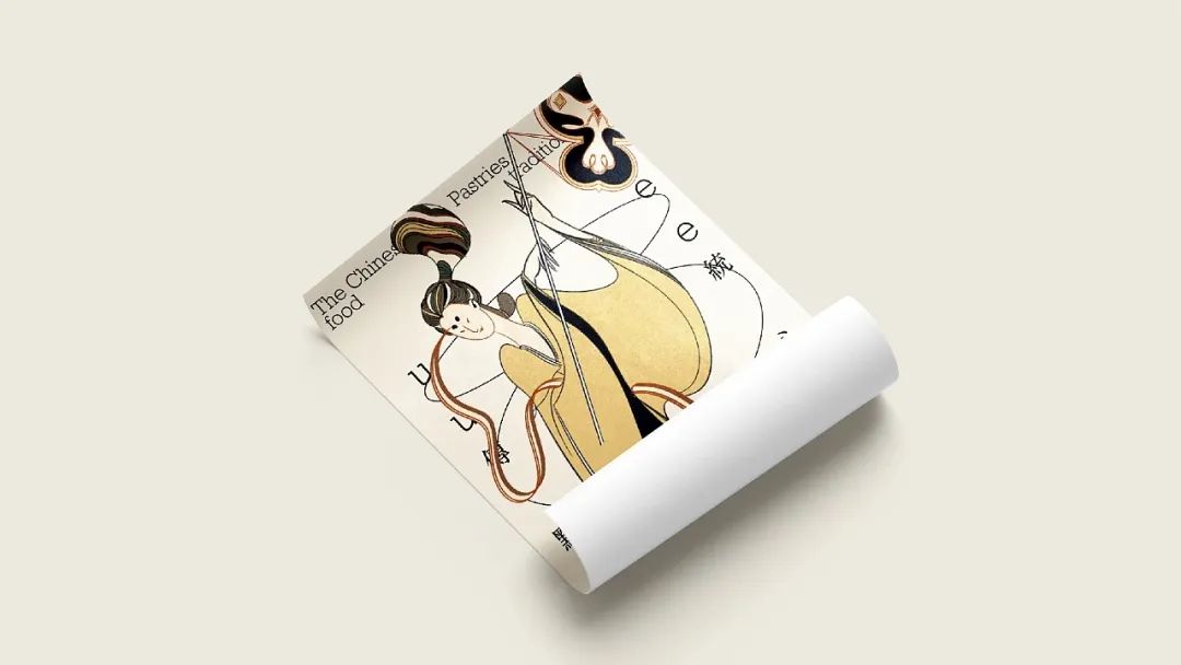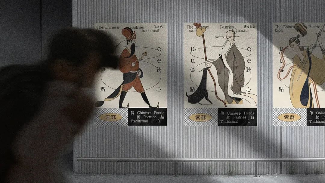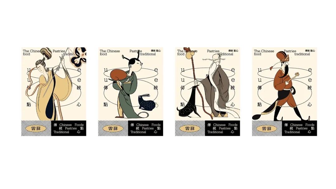 传统点心以江南荷花酥、飘香桂花糕、翡翠青团和茶香龙井酥为主打,并根据不同点心的特色属性,在包装等视觉延展上插入著名古人形象,通过采用细腻的工笔画手法,将古人的衣纹、发丝、优雅姿态等细节精确表现出来,中式传统颜色的搭配和层次渲染,使整幅画面更加生动立体,呼应品牌的中式风格。