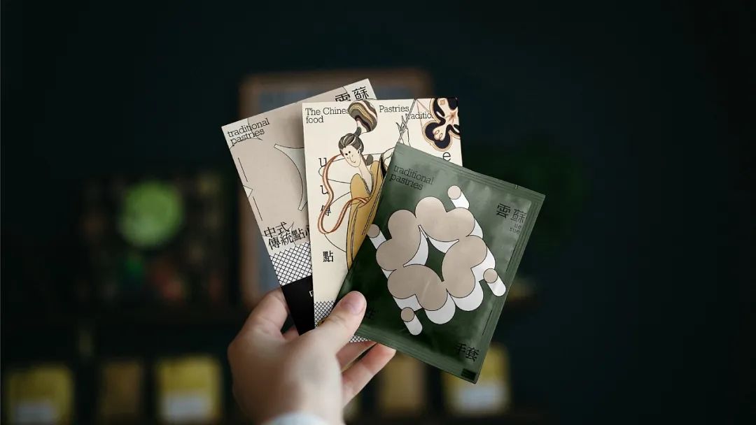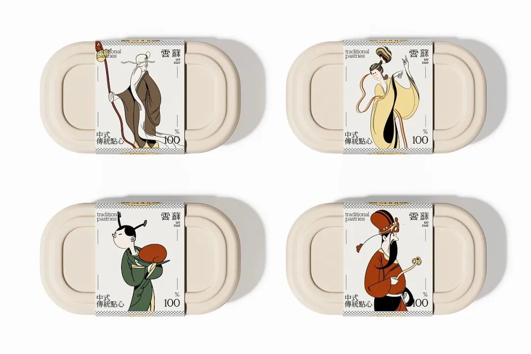 糕点包装盒则采用色彩较为淡雅的可再生材质包材进行制作,搭配古典人物封套,简洁而不失亮点。这样的包装形式,往往更适用于即时制作糕点的门店,既起到有效传递产品信息、提高辨识度、为品牌积累视觉资产的作用,又方便消费者随时开启食用,打造更雅趣的产品体验。