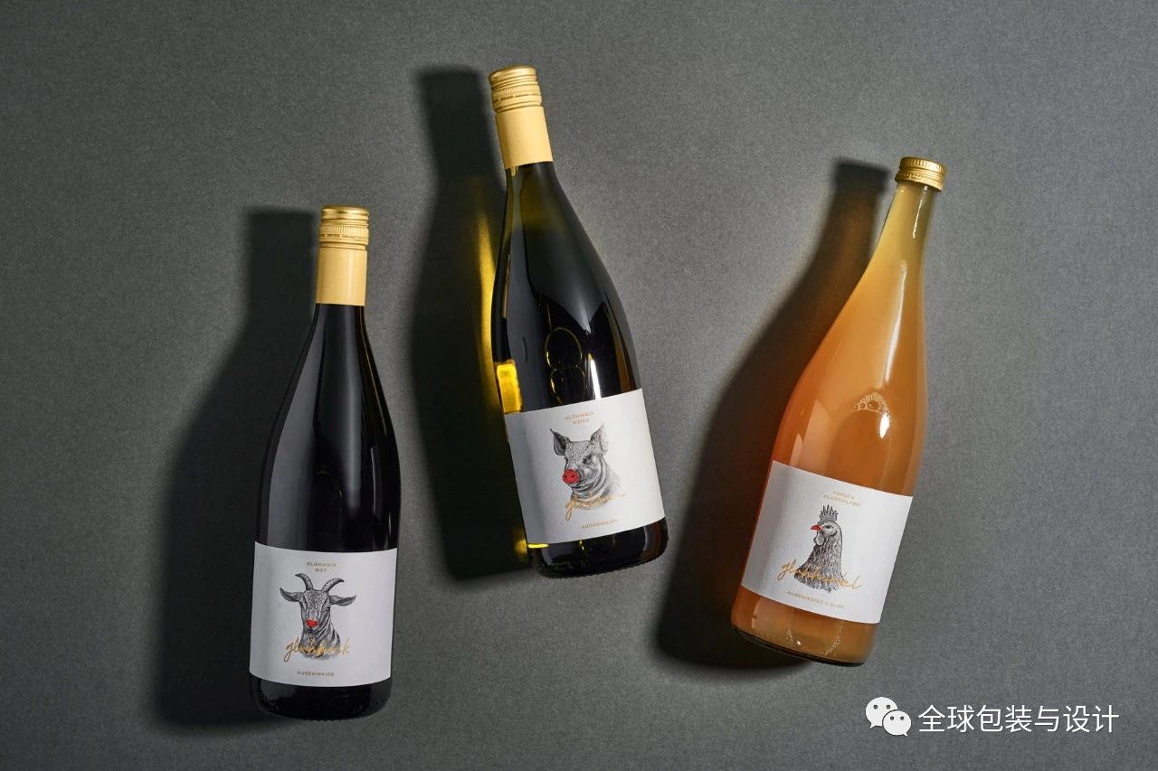 瓶子以绘画风格展示了奥根怀德的动物,带有经典的红色鲁道夫圣诞鼻子。每种动物代表一种热葡萄酒或潘趣酒。为了更加突出地域性,动物被写成了帕拉蒂尼方言:GLühsau——白热葡萄酒,GLühbock——红热葡萄酒,GLühhinkel——无酒精儿童潘趣酒。
