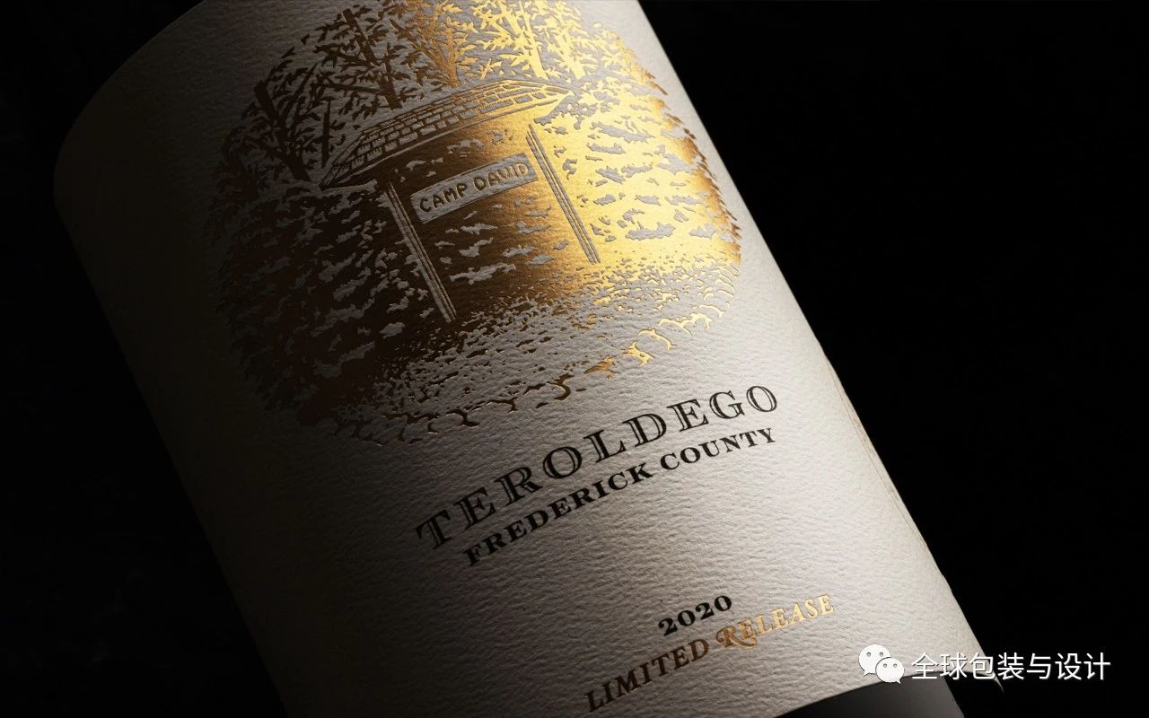 奢华的天然毛毡标签以优雅的金箔为特色,包括营地著名标志前部和中部的木刻插图。
