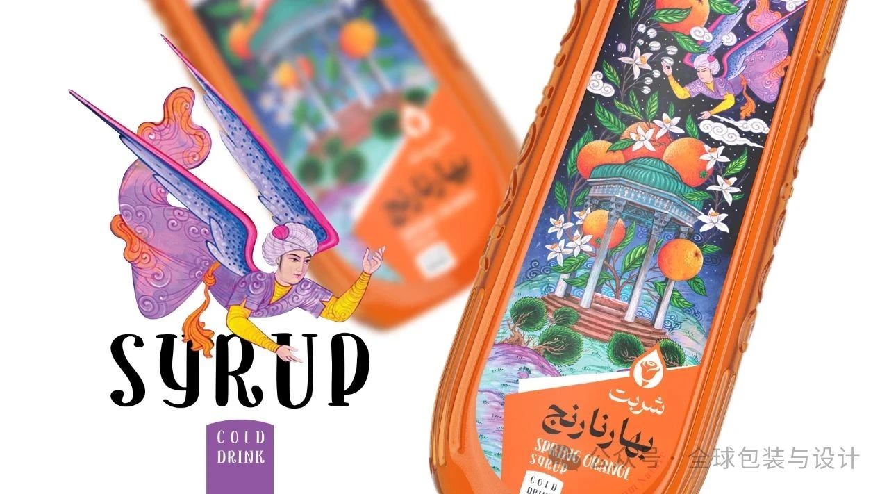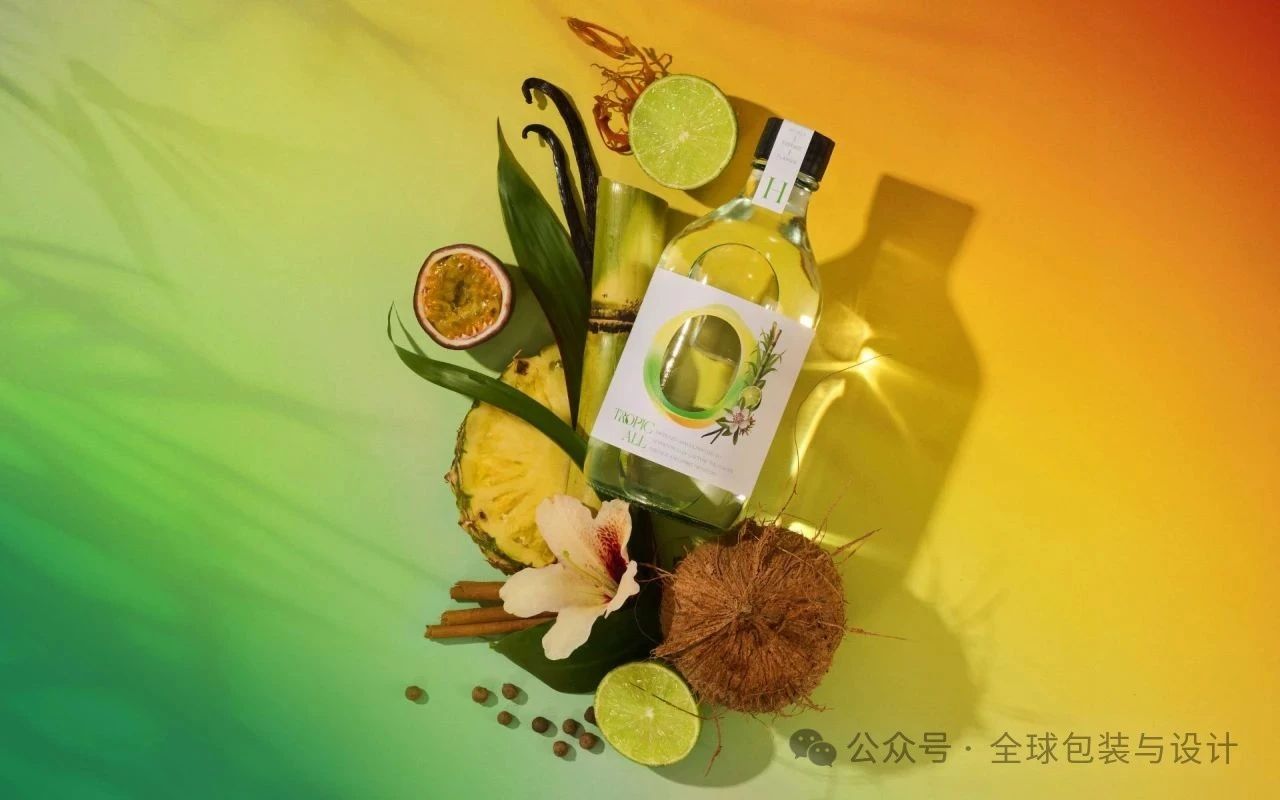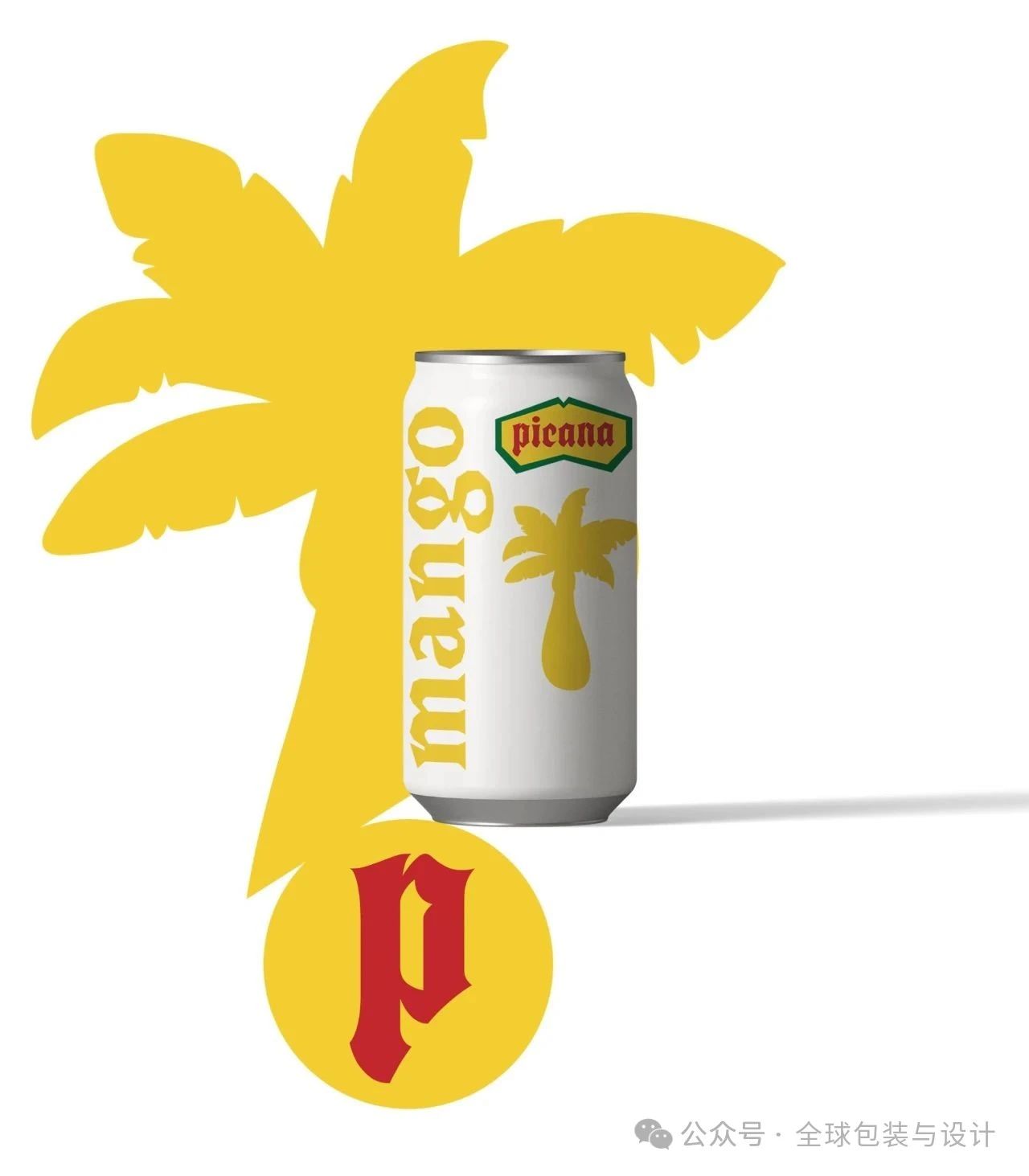 字体设计:垂直包装的中世纪风格字体的选择很聪明——它将热带和历史、新鲜和永恒并列在一起。它暗示了一个既有根源又有前瞻性的故事。简而言之,它不仅仅是卖饮料;它戏弄了一个神话。色彩故事:黄色代表热情和芒果,橙色代表桃子——这是直观和感官的。在啜饮之前用味觉的语言说话。