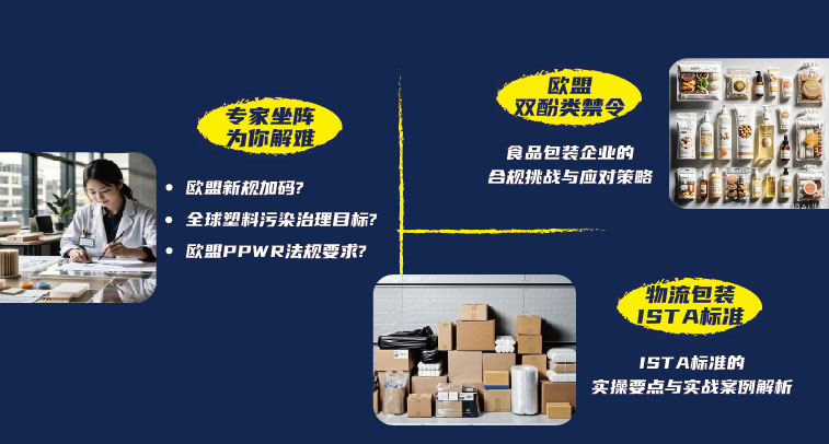 欧盟双酚类禁令、物流包装 ISTA 标准等热点海外包装法规,有专家现场深度解读、答疑,把复杂法规拆解成易懂的合规指南,让你轻松跨越国际包装法规门槛,在双碳时代顺畅开拓市场。
